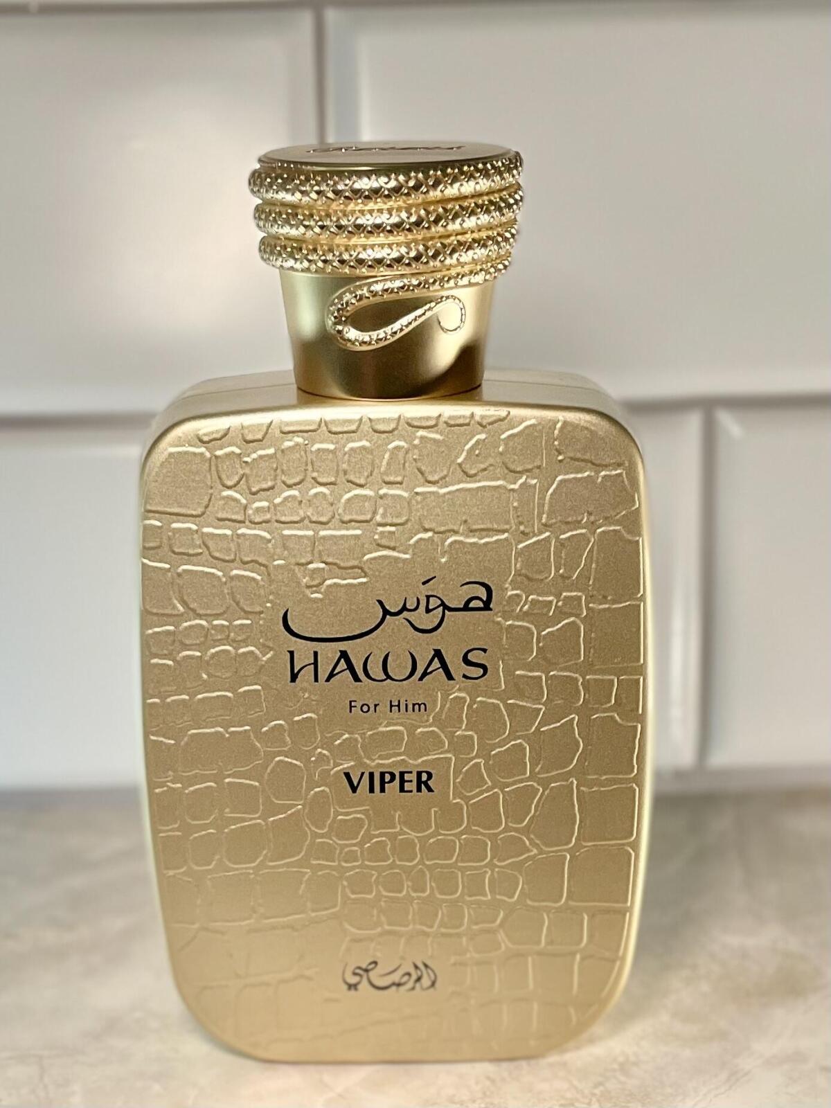 Hawas Viper by Rasasi is a Oriental fragrance for men. This is a new fragrance. Hawas Viper was launched in 2025. Top notes are Saffron, cannabis, Thyme, Green Notes and Davana; middle notes are Tobacco, Coffee, Raspberry, Cinnamon and Violet; base notes are Tonka, Musk and Gurjan balsam.